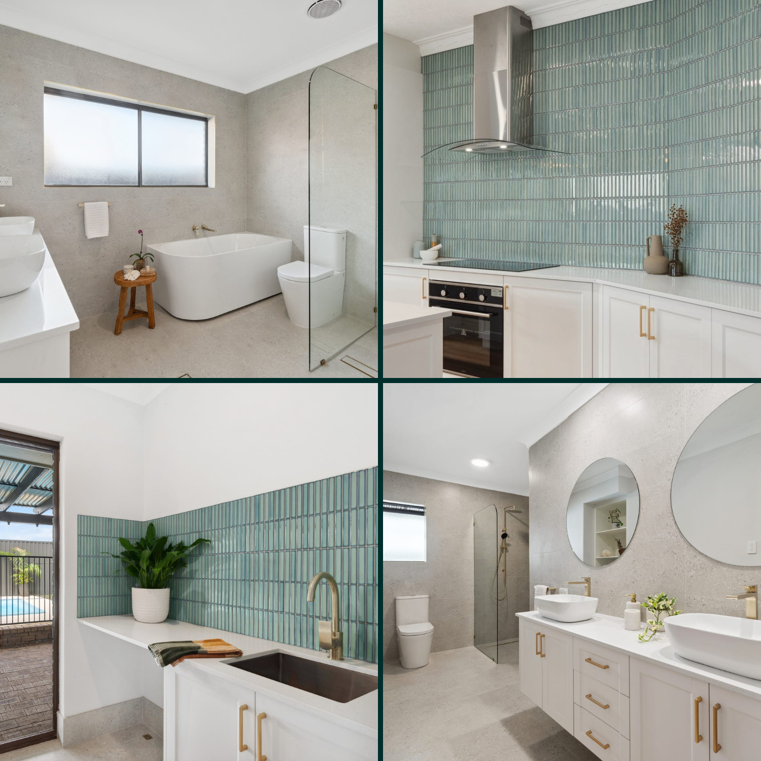 For this returning customer in Thornlie, we completed a stylish renovation featuring two modern bathrooms, a kitchen, and a laundry splashback. The design incorporates a sophisticated blend of textures, with sleek, large-format tiles and a striking green backsplash that adds a touch of elegance to both the kitchen and laundry. The customer chose brushed gold tapware from our collection, adding a luxurious accent that complements the neutral tones of the space. The result is a cohesive and contemporary look that brings a fresh and vibrant feel to the home.